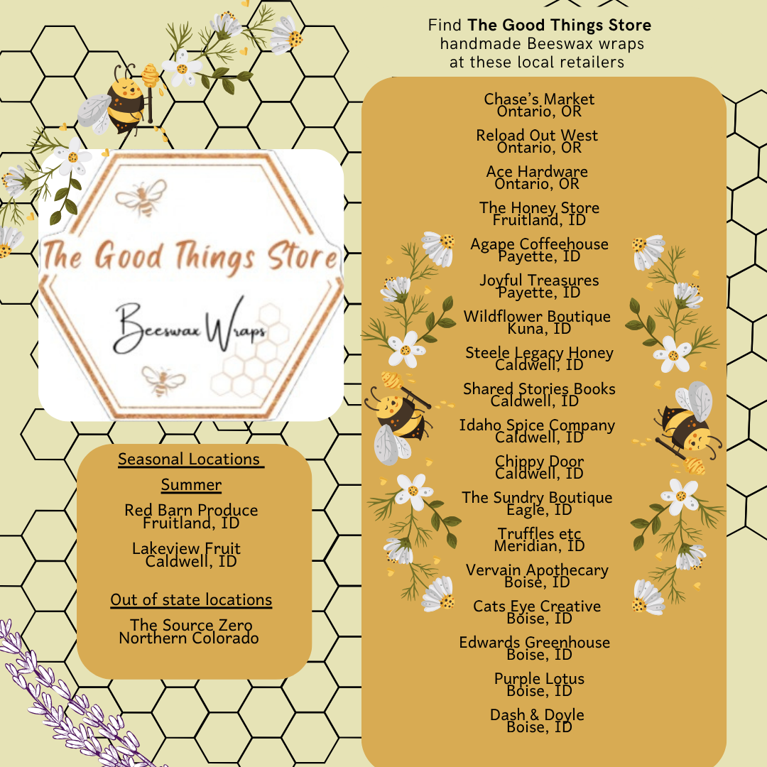 Find my handmade beeswax food wraps on display at many local retail stores throughout the Treasure Valley